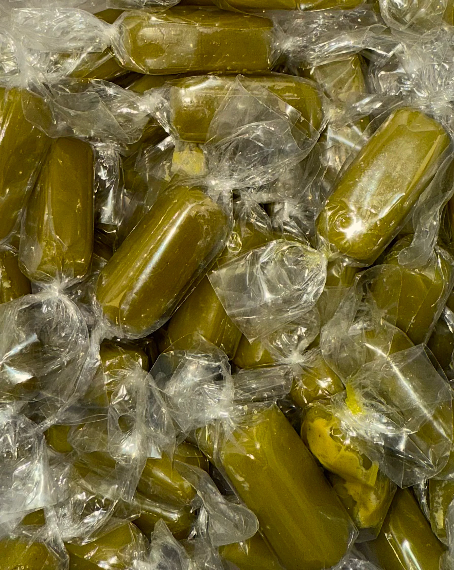Ingrédients : sucre, sirop de glucose, caramel (sucre, sirop de glucose, eau), crème de pistache (pistaches, sucre, huile végétale, lécithine végétale), arômes naturels, colorant naturel, cire de carnauba, stéarate de magnésium végétal, sel, acide citrique.
