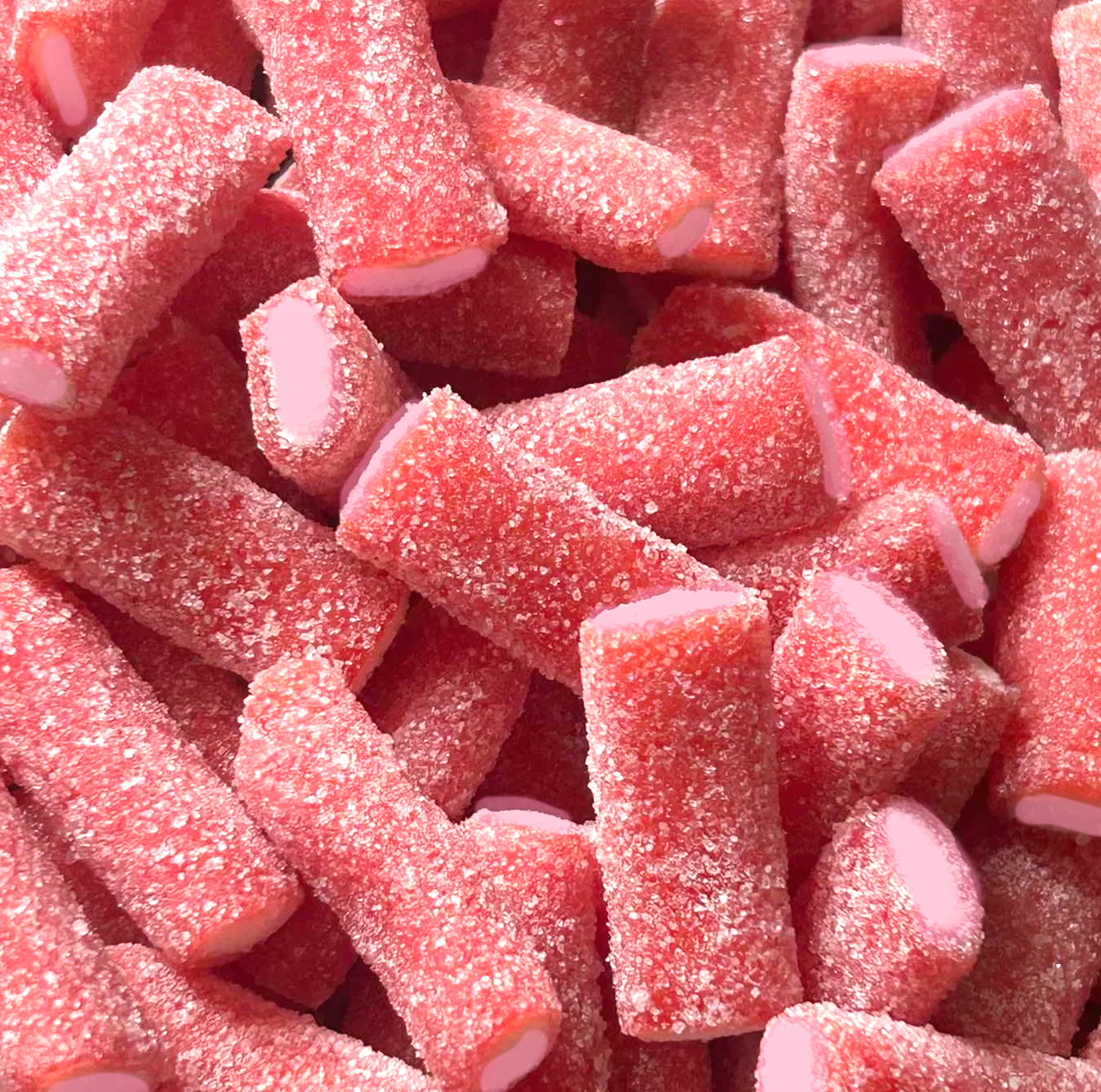 INGREDIENTS : Sirop de glucose-fructose, sucre, amidon, farine de blé (gluten), sirop de sucre inverti, eau, acidifiants (E330, E296), amidon de pomme de terre, maltodextrine, humectant (E422), correcteur d’acidité (E332), graisse végétale (palme), gélatine de bÅ“uf halal, arôme artificiel, colorants (E133), agents d’enrobage (monostéarate de glycérol (tournesol, E471)), huile végétale (coco, karité), émulsifiant (E322)