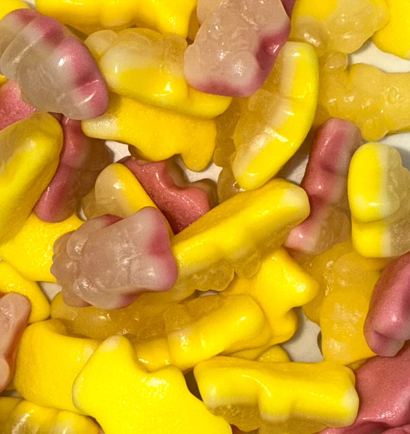 Ingrédients: Sirop de glucose, sucre, eau amidon modifié de pomme de terre, gélatine de boeuf halal, acidifiants: E330 E296 E270,aromes,colorants: E102 E129,huile végétale (palme),agent de démoulage: cire de carnauba.