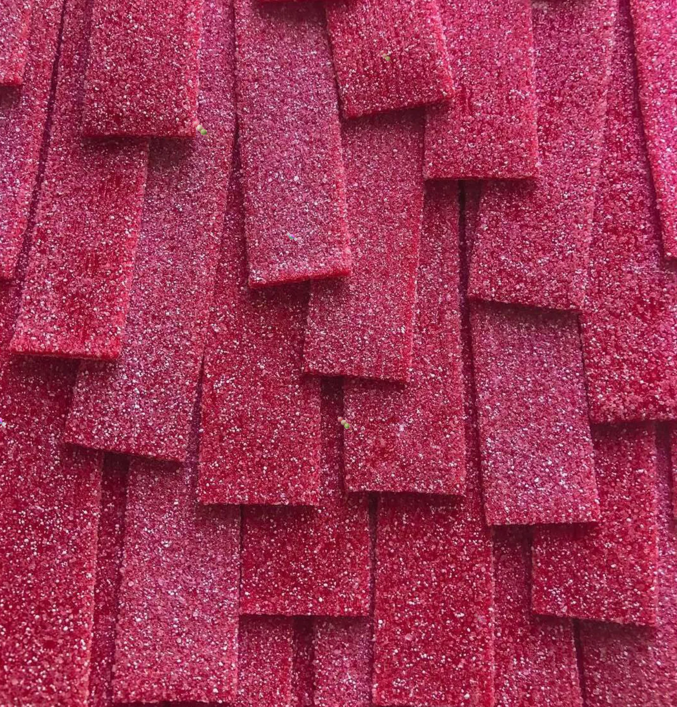 Ingrédients : Sucre, farine de blé ( contient du gluten ), sirop de glucose, eau, amidon de Maïs, humectant : glycérine, acidifiants : acide citrique, acide malique, graisse végétales ( palme ), acidifiant : citrate de sodium, arômes, émulsifiant : E471, conservateur : sorbate de potassium, colorant E-120