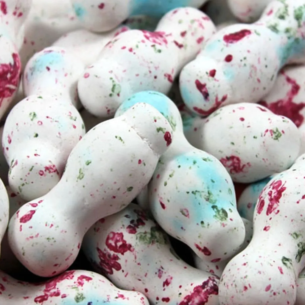 Ingrédients : Dextrose, sucre, gomme base, sirop de glucose, acide citrique, arômes, colorants : E133, E141, E160a, concentré de carotte noire, agent d’enrobage E904, antioxydant E321. Sans gluten. Convient aux végétariens.