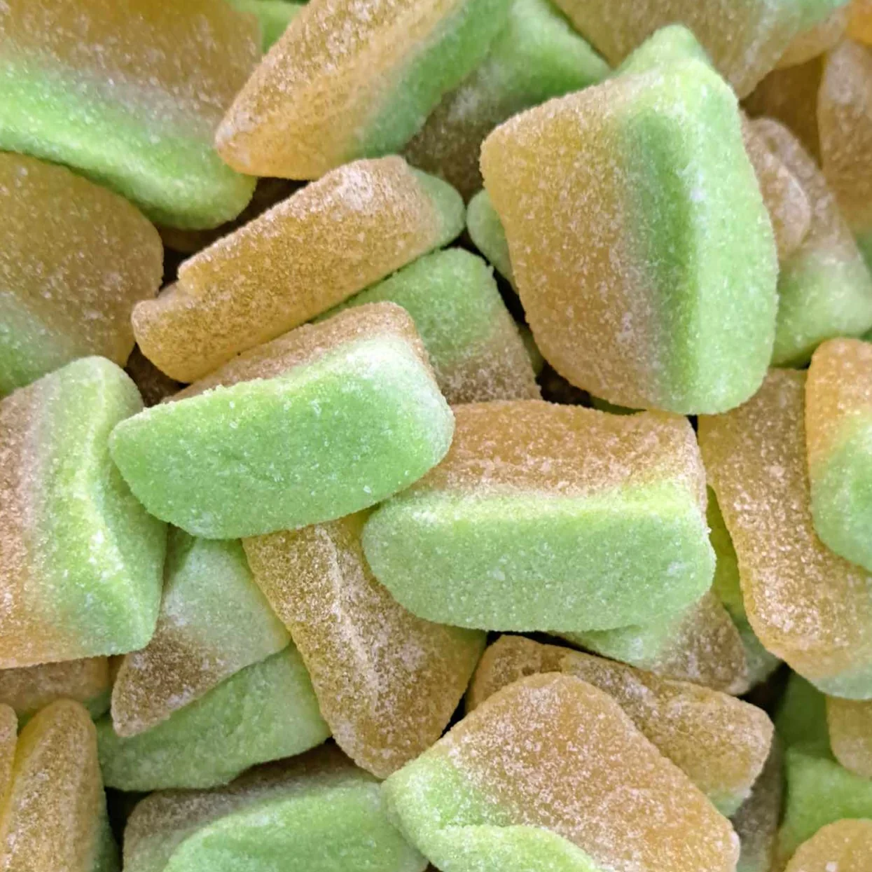INGREDIENTS: Sirop de glucose, sucre, eau, gélatine bovine halal, acidulants : E330, E296, E270, Gélifiant : pectine, arômes, colorants : E102, E150c, E171, agent d’enrobage : huile végétale (palme) et cire de carnauba.